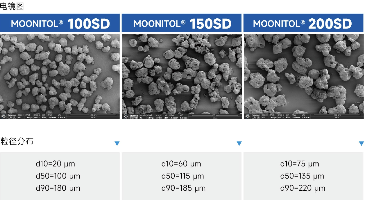 通過噴霧干燥制得的顆粒狀甘露醇SD系列,作為藥用輔料填充劑,具有良好的流動性、可壓性、混合性,特別適應(yīng)于直壓片工藝和直接混料工藝。