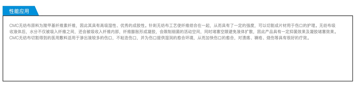 CMC無紡布是將羧甲基纖維素纖維以非織造工藝制備得到的無紡布產品。非織造布產品柔軟疏松,同時又具有一定強度。CMC無紡布經后續分切可以制作成各種尺寸規格的敷料片材用于傷口護理。公司具有小批量研發及大規模生產所需要的各種設備,可根據客戶要求生產多種克重和寬幅的卷材,并可根據需要切割成任意規格的片材。